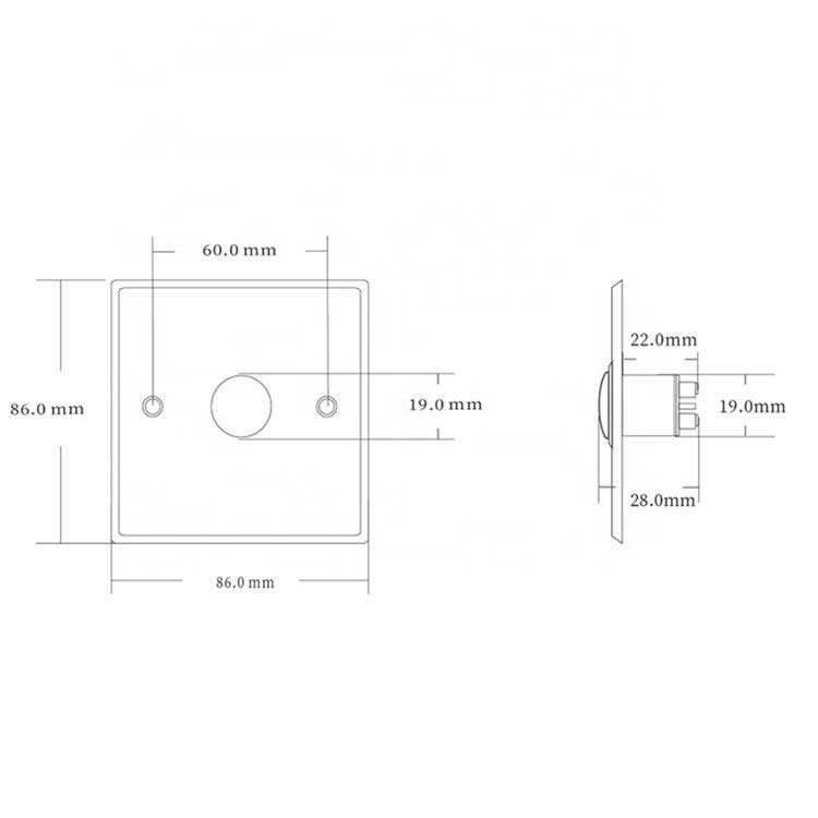 - ابعاد مرسوم پنل 86×86mm، نصب توکار